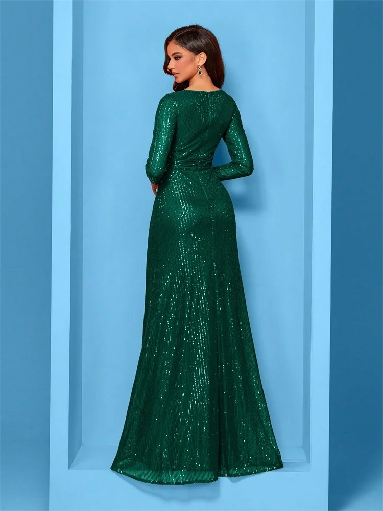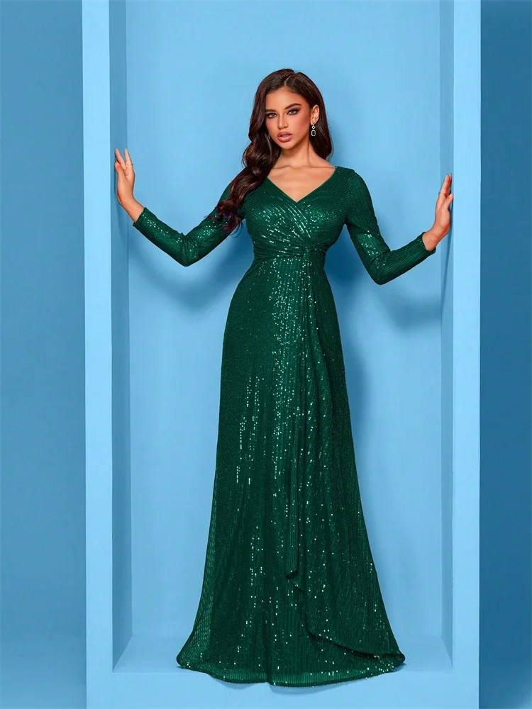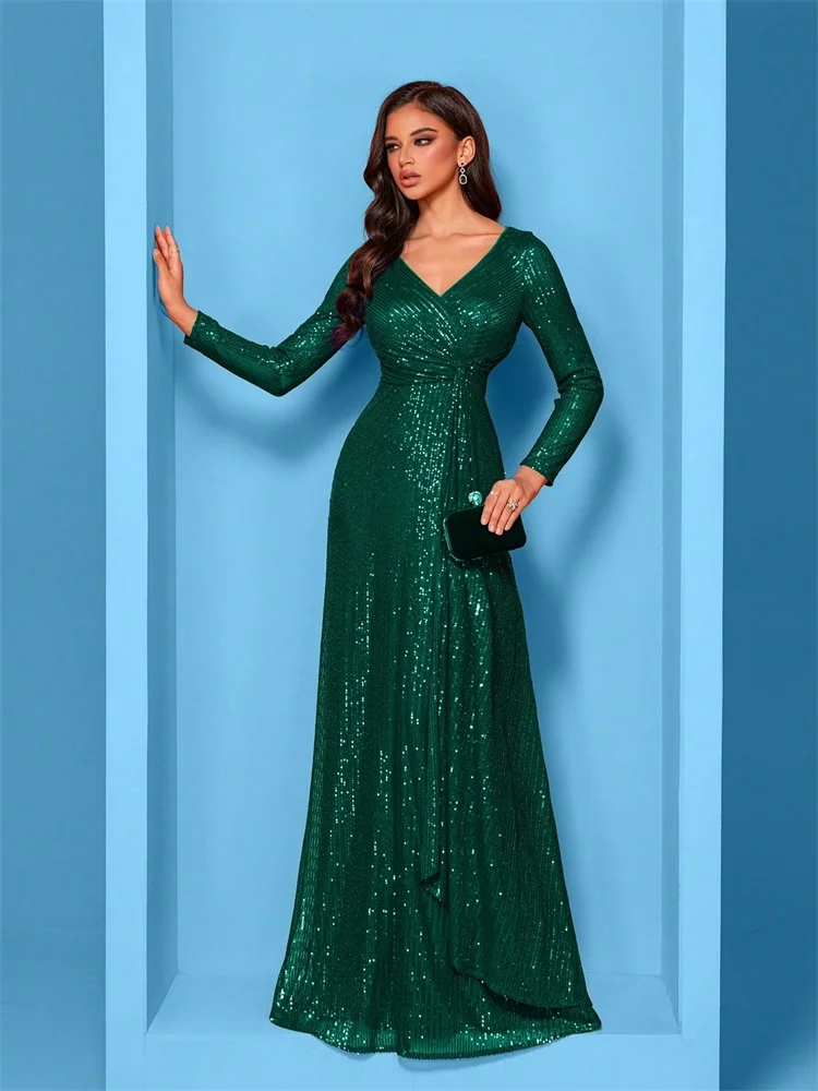 Luxury Floor Length V-Neck Evening Dress Women Elegant Party Maxi Dress Sequin Long Sleeves Prom Cocktail Dress Gowns