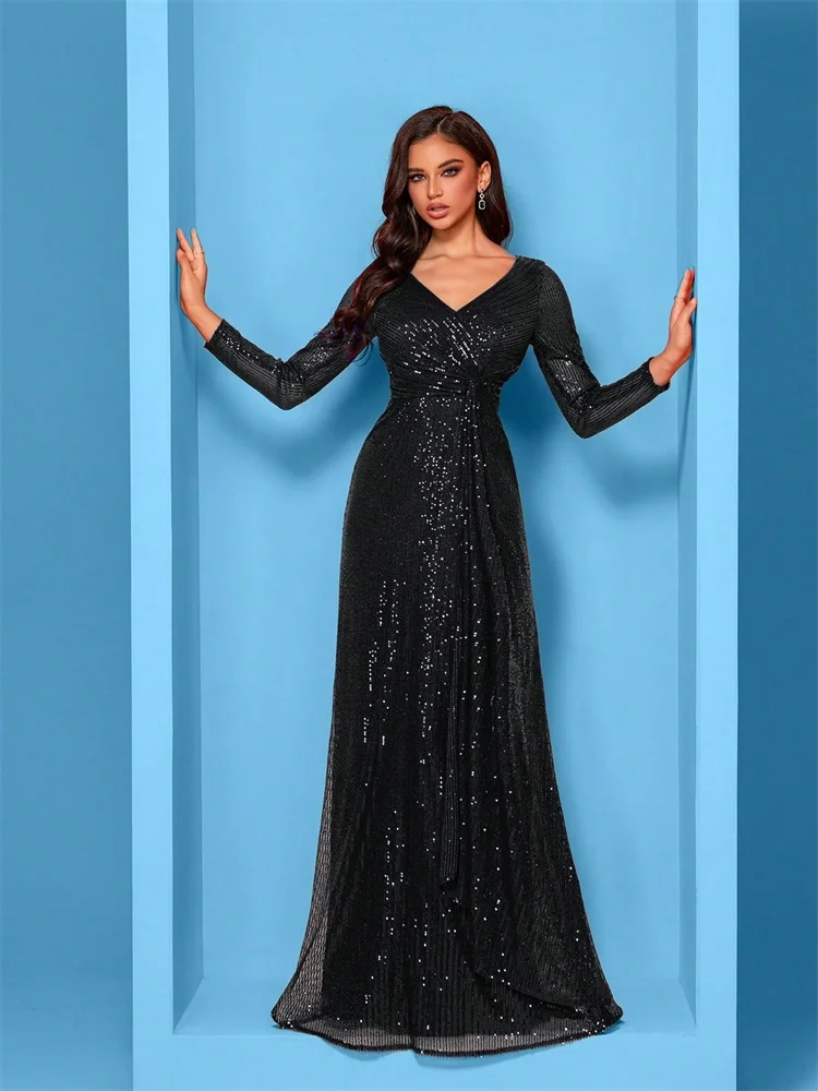 Luxury Long Sleeves V-Neck Sequins Evening Dresses Elegant Wedding Party Women Guests Prom Cocktail Gowns