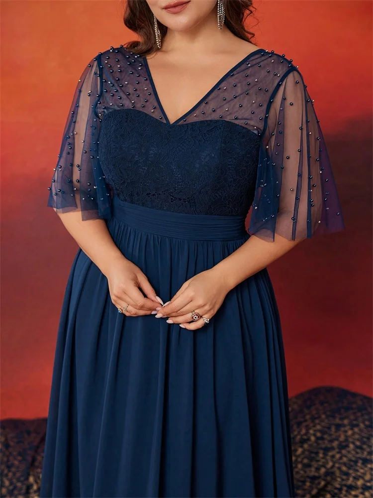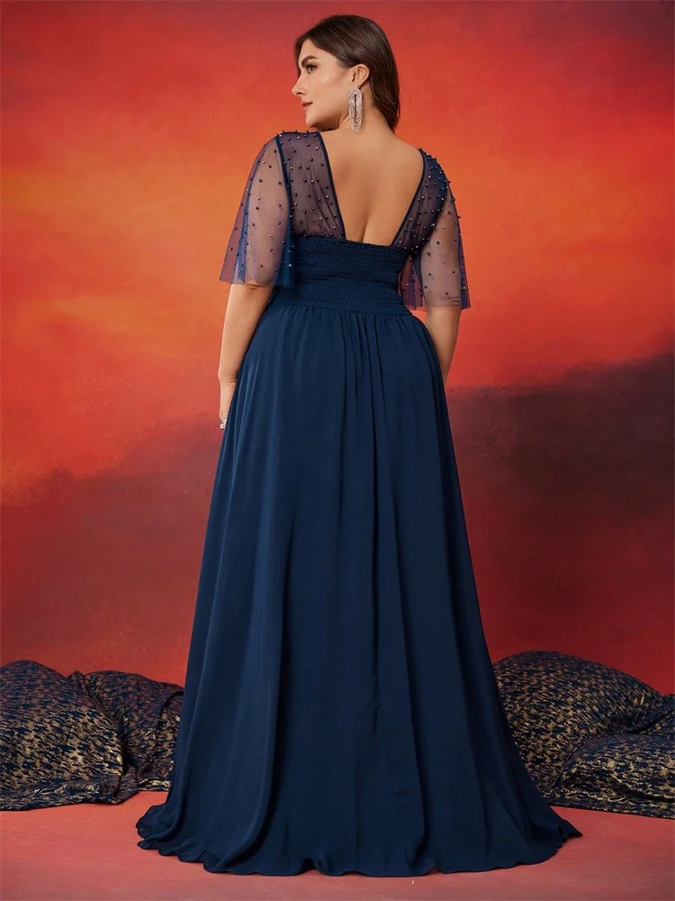 Plus Size Luxury V-Neck Chiffon Blue Evening Dress Women Elegant V-back Wedding Party Long Prom Cocktail Dress