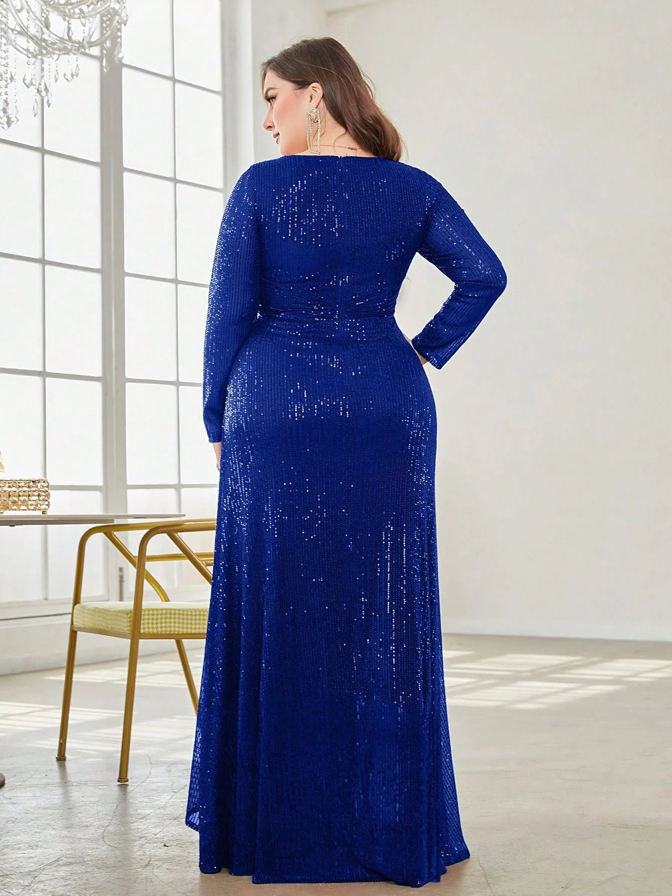 Plus Size Luxury V-Neck Long Sleeves Sequins Evening Dresses Women Elegant Party Maxi Cocktail Graduation Gowns
